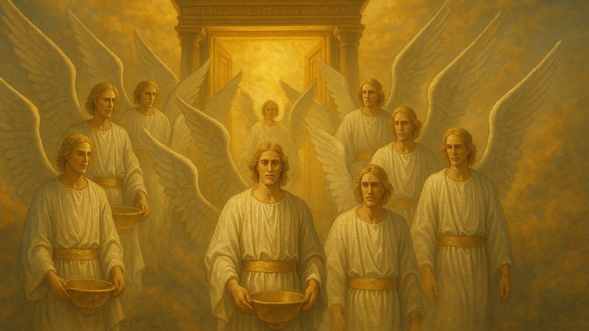 Ce passage solennel ouvre la scène la plus redoutable de l’Apocalypse. Il rappelle que le jugement de Dieu n’est pas arbitraire, mais juste, saint et inévitable. Les anges sortent du temple céleste, les coupes sont pleines, et le commandement divin est donné. L’histoire du monde touche à sa conclusion.