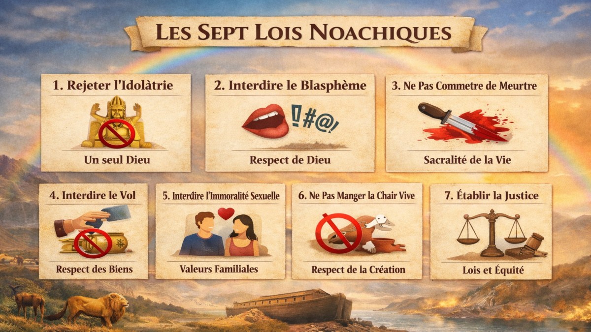 Les lois noachiques, souvent perçues comme des principes moraux bibliques, ont en réalité une origine rabbinique post-biblique. Elles n’existent pas explicitement dans les Écritures et visent à établir une éthique universelle pour les non-juifs. Leur promotion représente une forme de séduction religieuse à éviter selon la Bible.